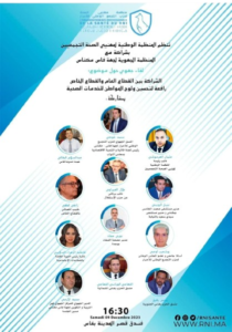 تنظم المنظمة الوطنية لمهنيي الصحة التجمعيين بشراكة مع المنظمة الجهوية لجهة فاس-مكناس لقاءا جهويا حول موضوع ” الشراكة بين القطاع العام والقطاع الخاص رافعة لتحسين ولوج المواطن للخدمات الصحية بعد غد السبت في تمام الساعة الرابعة ونصف بعد الزوال، بفندق قصر المدينة بفاس